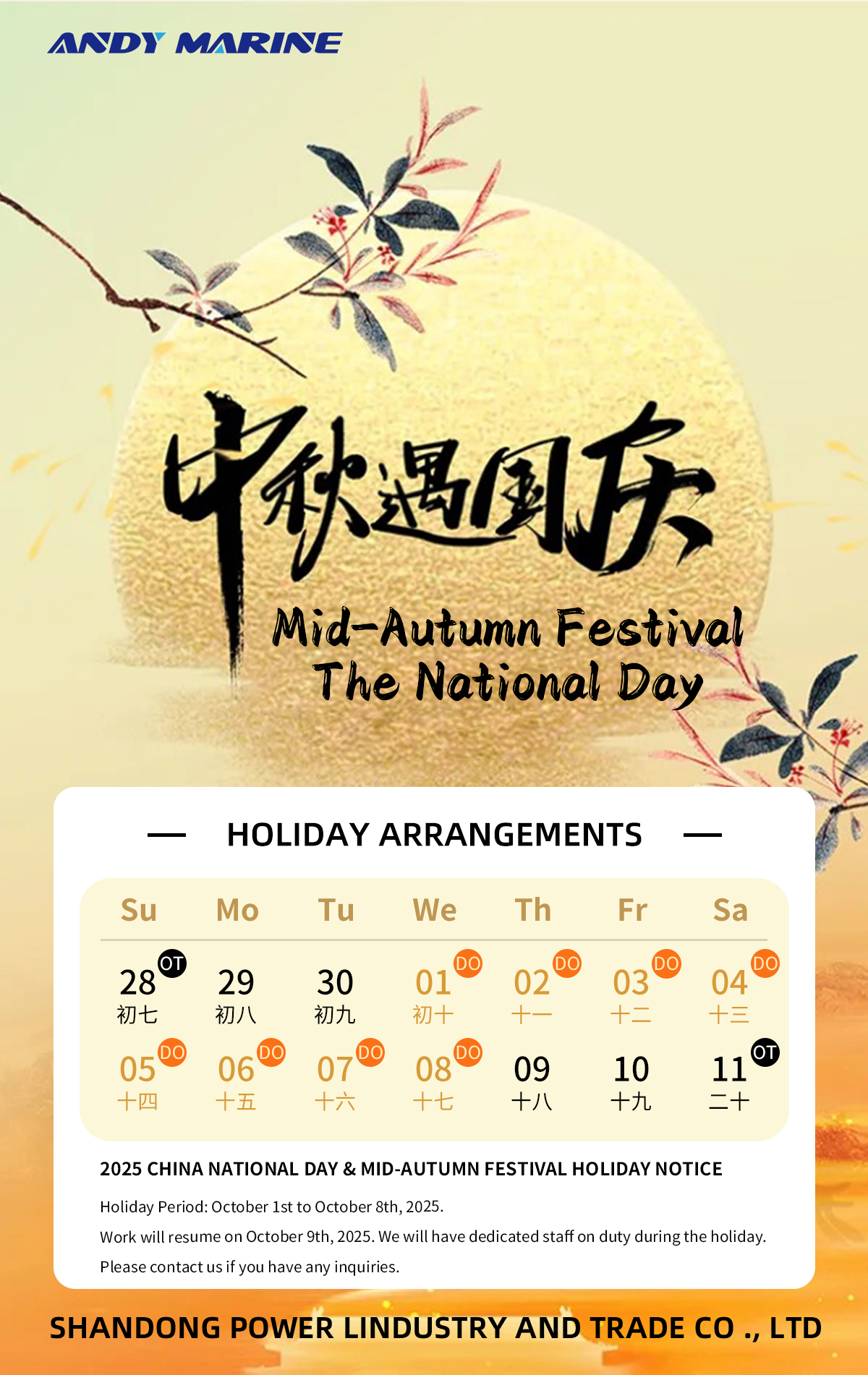 Ketika Hari Kebangsaan China mendekati, jadual Andy Marine adalah seperti berikut: